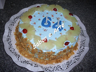 Foi decorado com chantilly, ananás, cerejas cristalizadas e missangas.