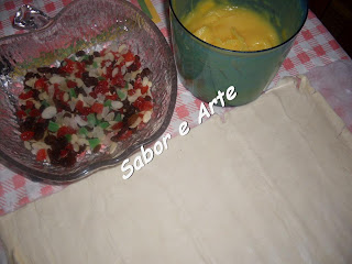Estende-se a placa, barra-se com o bage cremin e deitam-se as frutas picadinhas por cima.