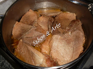 No fim deita-se 1 cálice de vinho do porto, deixa-se apurar, retira-se a carne, corta-se em fatias e voltam-se a colocar no tacho.